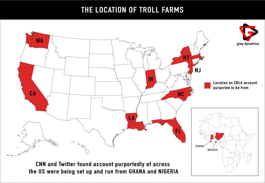 The prior location of the web brigade was discovered in an office block in St Petersburg. Following a CNN linked investigation, outsourcing beyond the country has been discovered to avoid similar discoveries. Troll farms were discovered and raided in Nigeria and Ghana. One farm was discovered operating under an NGO named Eliminating Barriers to the Liberation of Africa (EBLA), with over 200 Ghanaian trolls found with up to 1 million followers.