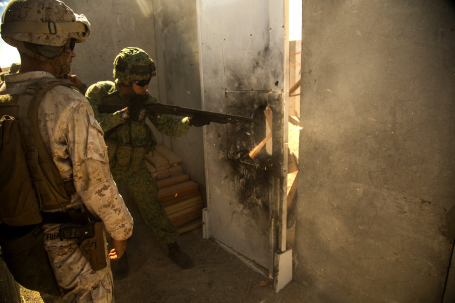 U.S. Marine Corps Sgt. Michael Fuentez, military police officer, 1st Law Enforcement Battalion, instructs soldiers from the Singapore Army Deployment Force on shotgun breaching during Exercise Valiant Mark 2016 at Marine Corps Air-Ground Combat Center Twentynine Palms, Calif. Sept. 29, 2016. This is the 25th year that U.S. Marines and the Singapore Armed Forces have met for Valiant Mark, which improves and maintains a high level of interoperability, enhanced military to military relations and to enriches mutual combat capabilities through combined training. | U.S. Marine Corps photo by Cpl. Akeel Austin