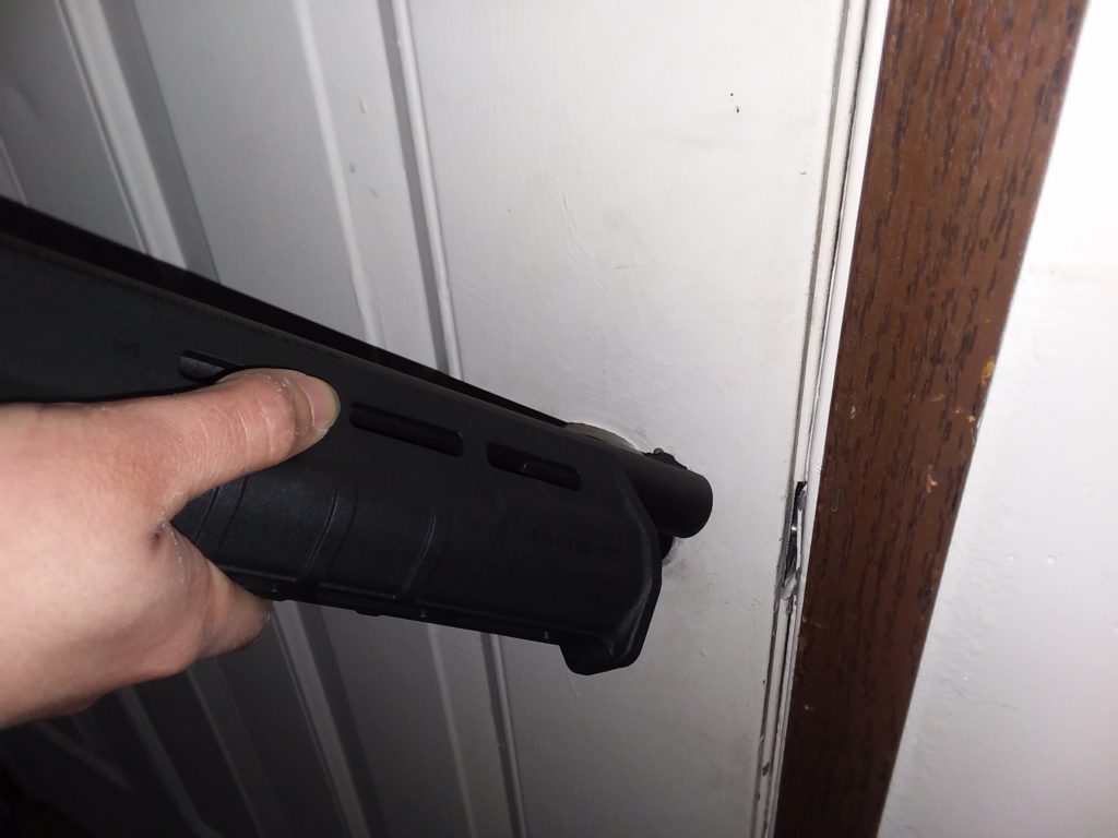 The biggest factors are the door’s shape, structure, and directional movement; these all equate to if a shotgun will be an adequate tool for a hard breach. Ideally all these aspects of the door and building should be determined prior to an assault or raid occurs but may need to be determined upon approach of the target building or point of entry. Situation dictates, so that kind of intel may not be available to everyone. For article’s sake, I will be describing the procedure from the perspective that breach information is acquired on approach to the breach-point. If the door is composed of a material that is destructible under a shotguns use, proceed. If the door is made of reinforced steel or something to that extent, an alternative breaching method should be used.