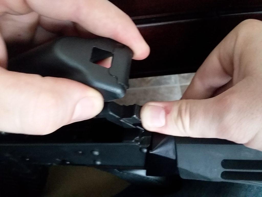 Before you can clean anything, we need to break the rifle down first. Before doing any disassembly we should remove the magazine and make sure that the rifle is unloaded. After this has been accomplished, we start by removing the dust cover. To do this, push the button on the rear of the dust cover forward and lift up the cover with the other hand; It should pop right off, but some can be snug or loose depending on wear. With the dust cover removed we are going to remove the spring/buffer assembly by pushing that same button forward until the entire rod/spring pops out of its fixture in the rear trunnion.