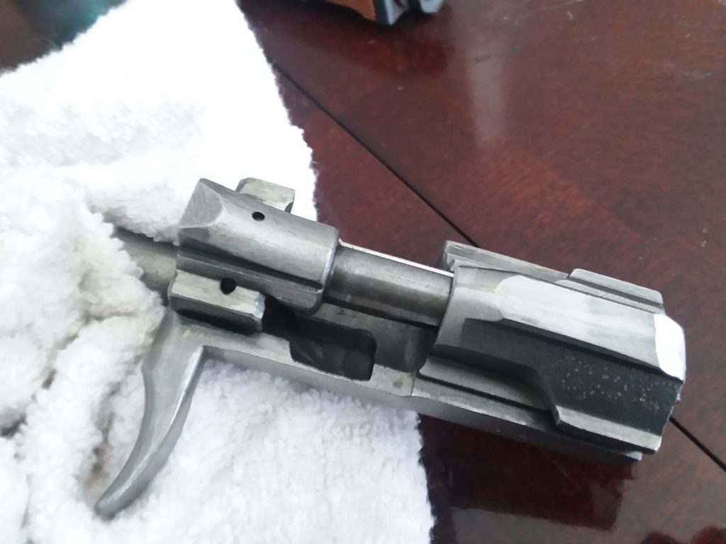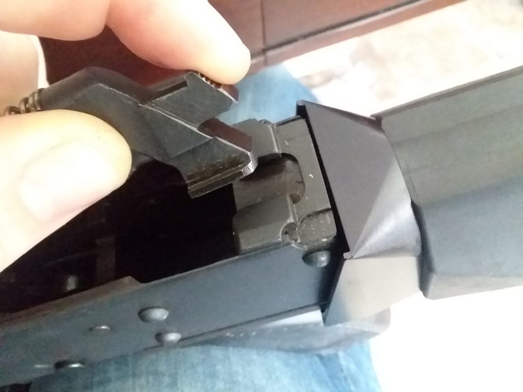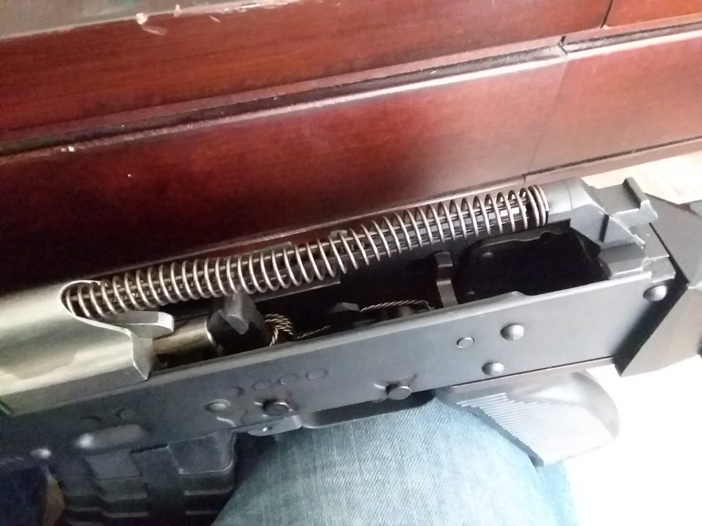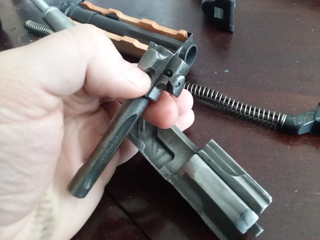 Next we remove the bolt carrier group/op-rod assembly, make sure the hammer is down and take the safety off. Then pull the BCG to the rear of the receiver and slide it up through the opening at the rear trunnion; it should lift out easily because of tension from the hammer underneath it. the bolt should twist out of the carrier in a clockwise motion with little effort.
