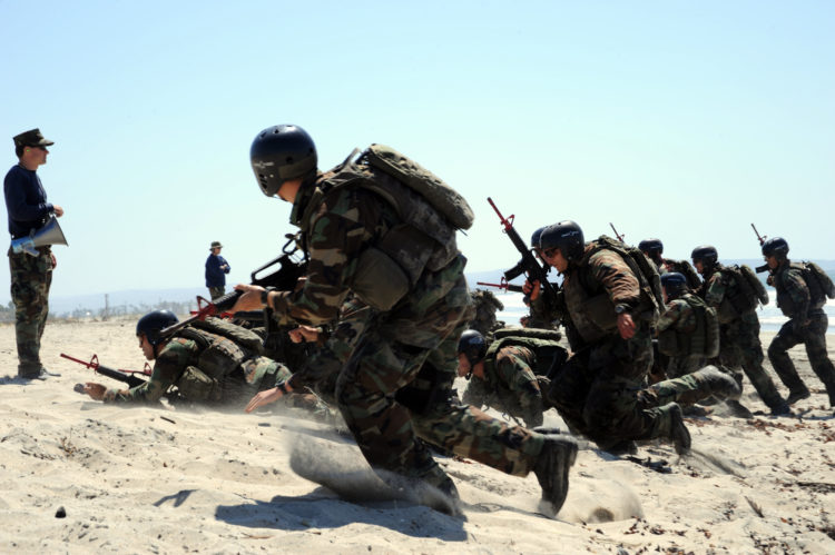 SAN DIEGO (Sept. 10, 2008) Crewman Qualification Training (CQT) students charge the beach during a medical evacuation drill at the Naval Special Warfare Center in Coronado, Calif. CQT is a 14-week advanced training course teaching basic weapons, seamanship, first aid and small unit tactics to Special Warfare Combatant-craft Crewman (SWCC) trainees. SWCCs operate and maintain the Navy's inventory of state-of-the-art, high-speed boats used to support SEALs in special operations missions worldwide. (U.S. Navy photo by Mass Communication Specialist 2nd Class Christopher Menzie/Released). (Source: U.S. Navy photo by Mass Communication Specialist 2nd Class Christopher Menzie, Public domain, via Wikimedia Commons)