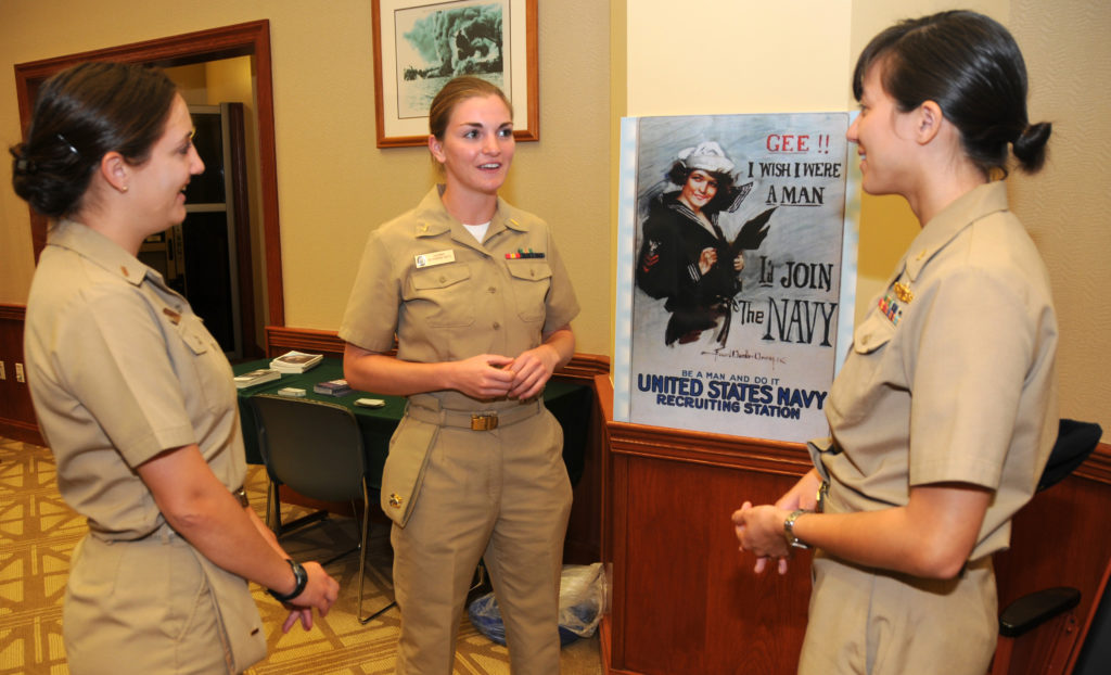 PEARL HARBOR (Jan. 19, 2010) Ensign Megan Kunkemoellen, left, Ensign Lauren St. Pierre-Hetz, and Ensign Kaylene Klingenstein discuss their personal experiences as women in the Navy at the 2010 Surface Navy Women Symposium. Hosted by Commander, Destroyer Squadron (DESRON)31 and sponsored by Commander, Naval Surface Forces, the symposium focused on current issues and future initiatives applicable to women in the surface Navy. (USce: US Navy photo by Mass Communication Specialist 2nd Class Mark Logico, Public domaUSvia Wikimedia Commons)