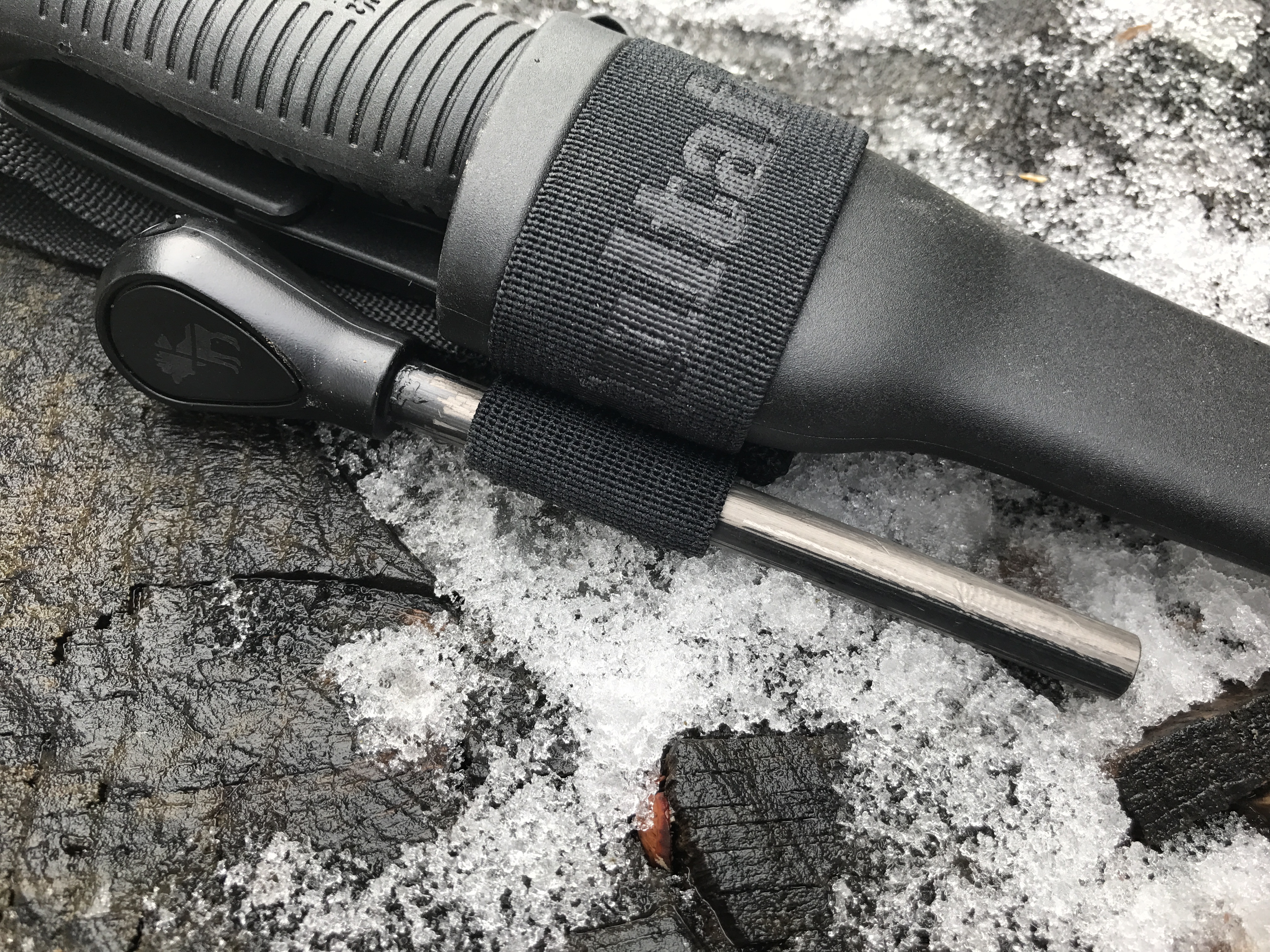 The spine of the blade is set to a 90 degree angle for use with striking ferro rods or magnesium blocks. The sharp 90 degree spine is also useful for scraping fine fibers off wood when prepping tinder to get a fire started. The blade is also protected with a black protective electrophoretic deposition coating (EPD). This coating will repel rust and corrosion when in the field for longer periods of time.