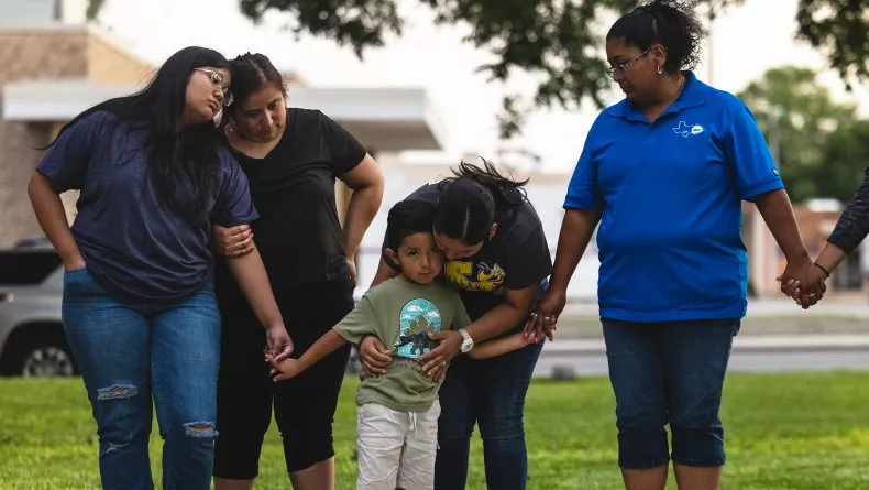Members of the community gather at the City of Uvalde Town Square for a prayer vigil in the wake of a mass shooting at Robb Elementary School on May 24, 2022, in Uvalde, Texas. Republicans have shared messages of condolences to the families of the victims. JORDAN VONDERHAAR/GETTY IMAGES