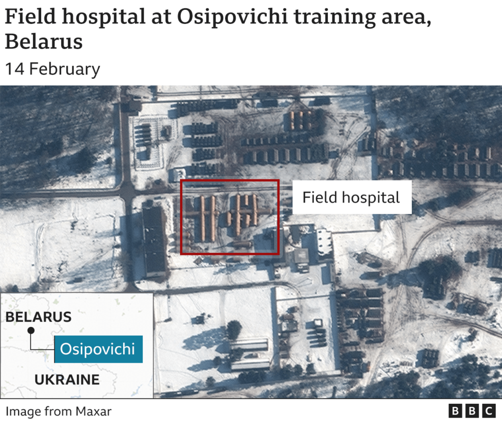 A new field hospital located at the Osipovichi Training Area in North-western Belarus, February 14 (MAXAR via BBC)