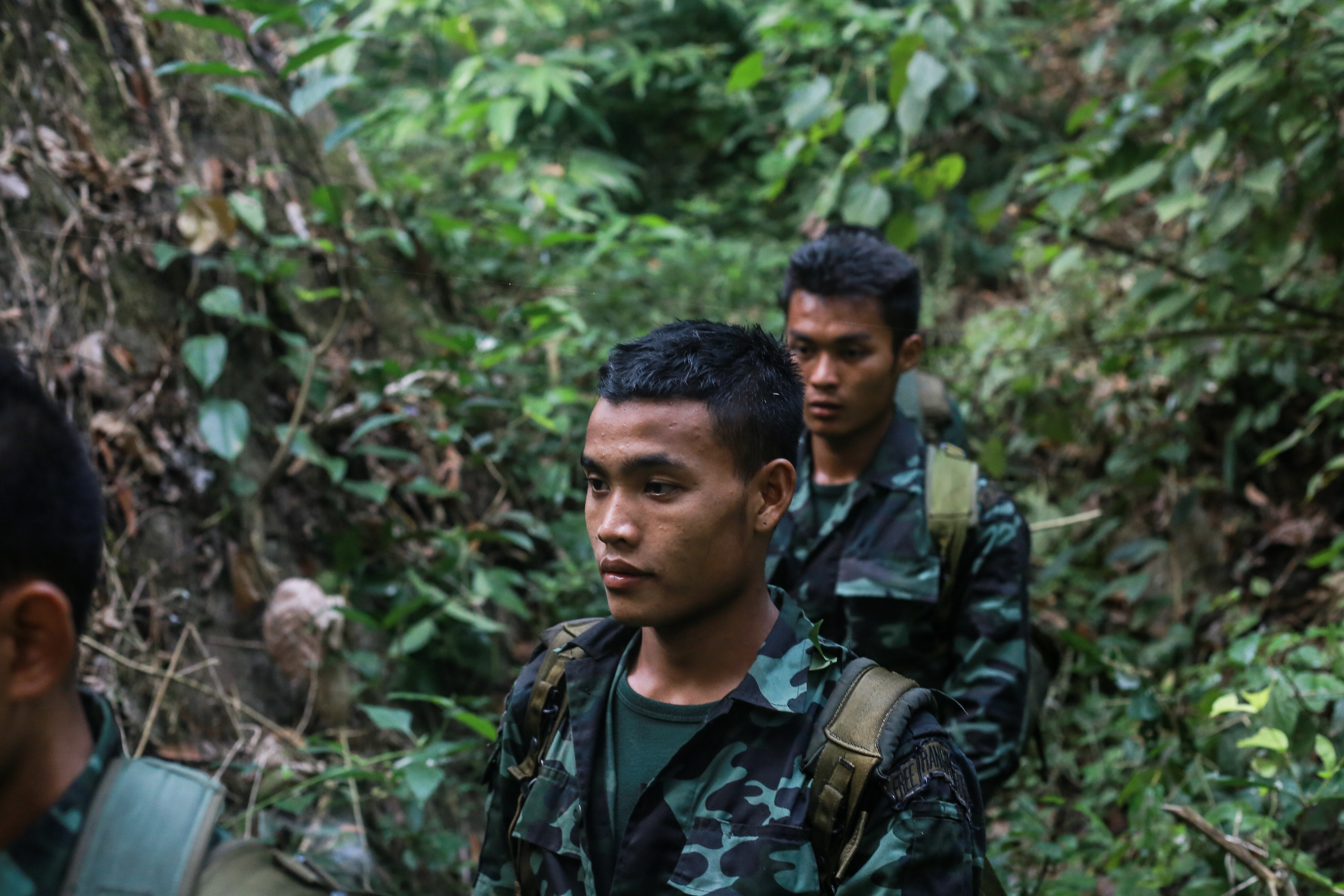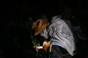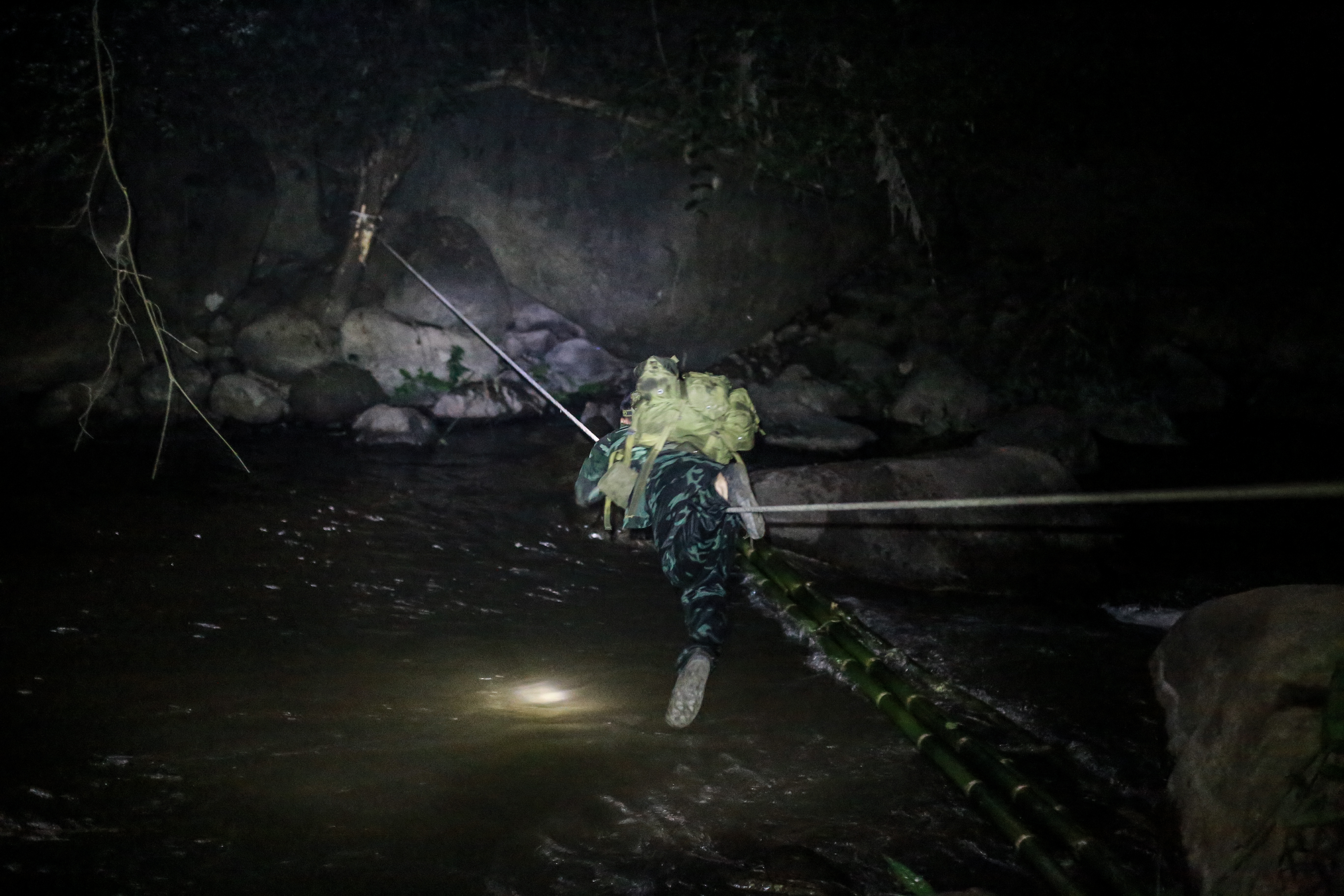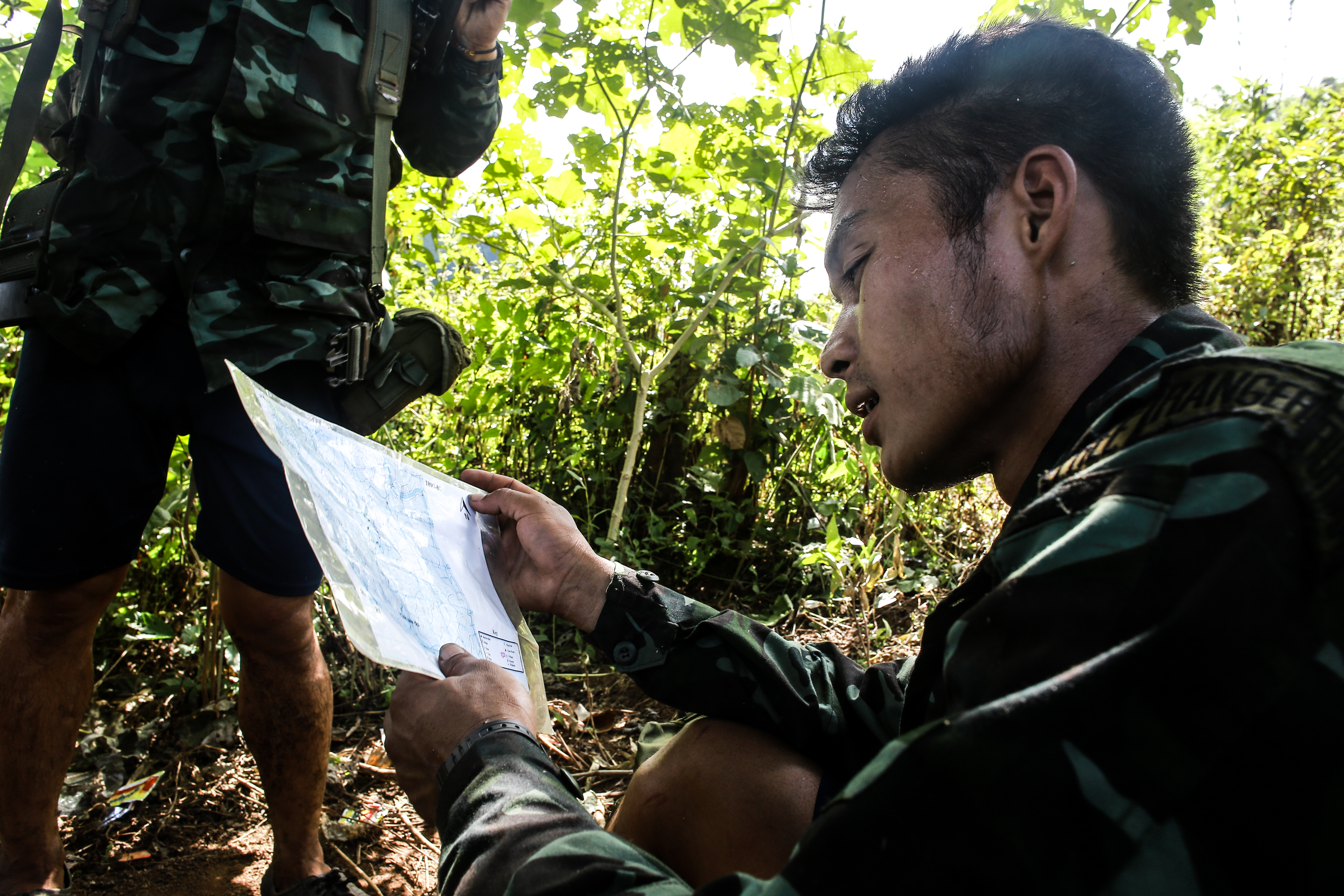 At exactly 10 minutes, Saw Eh Htoo motions them to rise. They search for 30 more minutes before arriving at an abandoned house, where instructors are standing by a fire. There’s a whimper coming from behind the building, and the rangers find a young boy from a nearby village acting as an injured civilian. They carry him to a sheltered position, examine him for injuries, and find a wound on his thigh. They apply a tourniquet and check for head injuries.