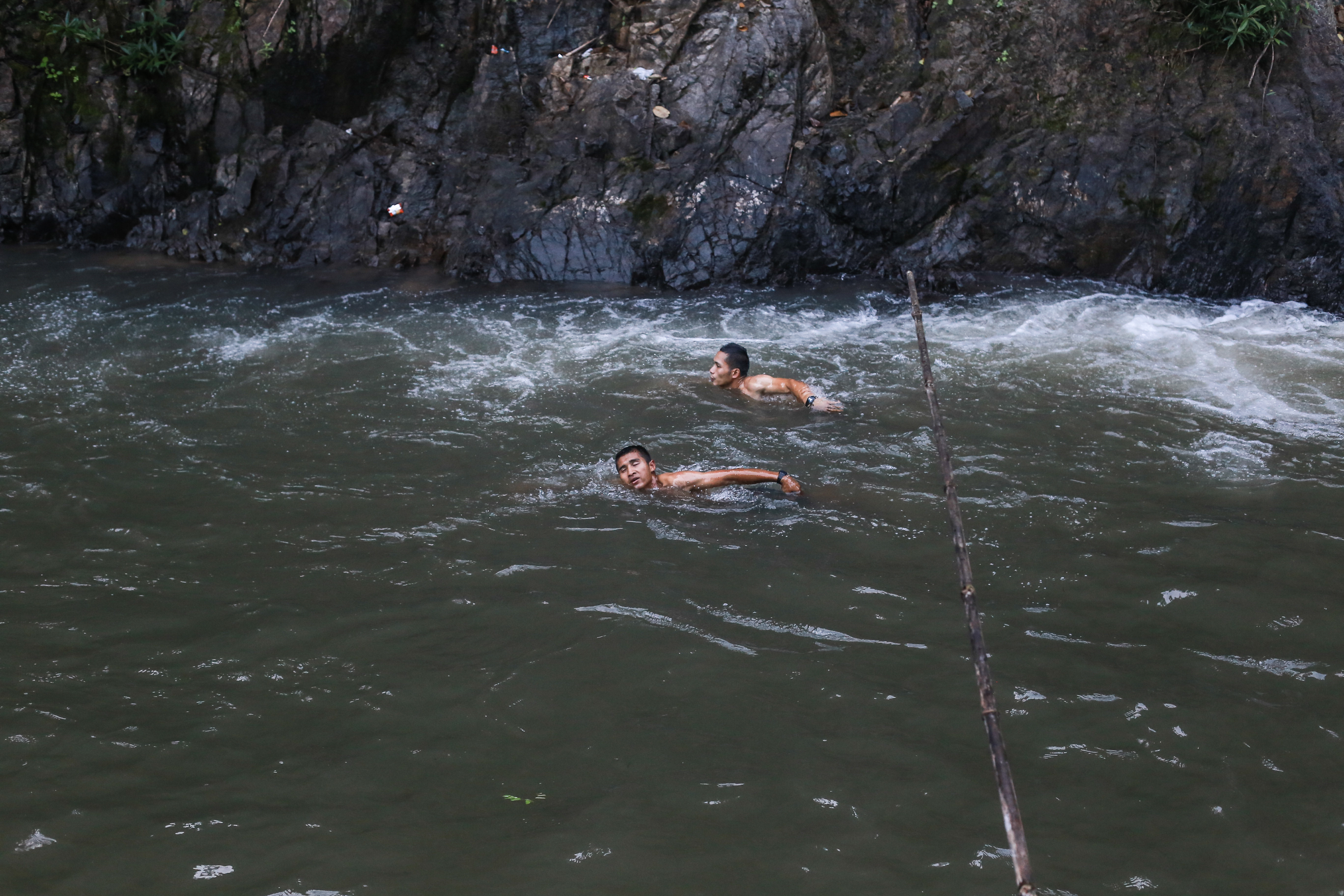 The team rushes to the river to begin its self-defense test. Stripping down to their shorts, members execute the moves they’ve been taught in training. Once finished, they run to the river. They swim 15 laps upstream and downstream, using a different stroke each time. Successful and soaking wet, they dress and head out to another navigation point far from camp.