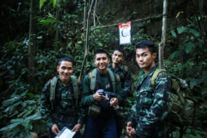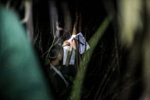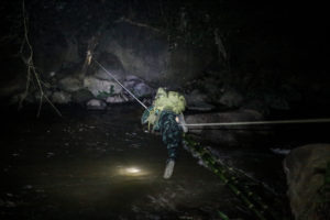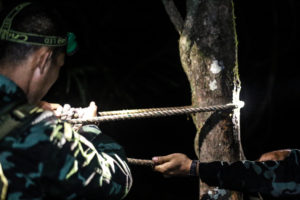 Out of camp, the moon, stars, and intermittent use of headlamps provide the only light. The jungle is thick, and team members must be aware of the dangers of snakes and other creatures difficult to see in the dark, as well as steep terrain that sometimes turns to outright cliffs.