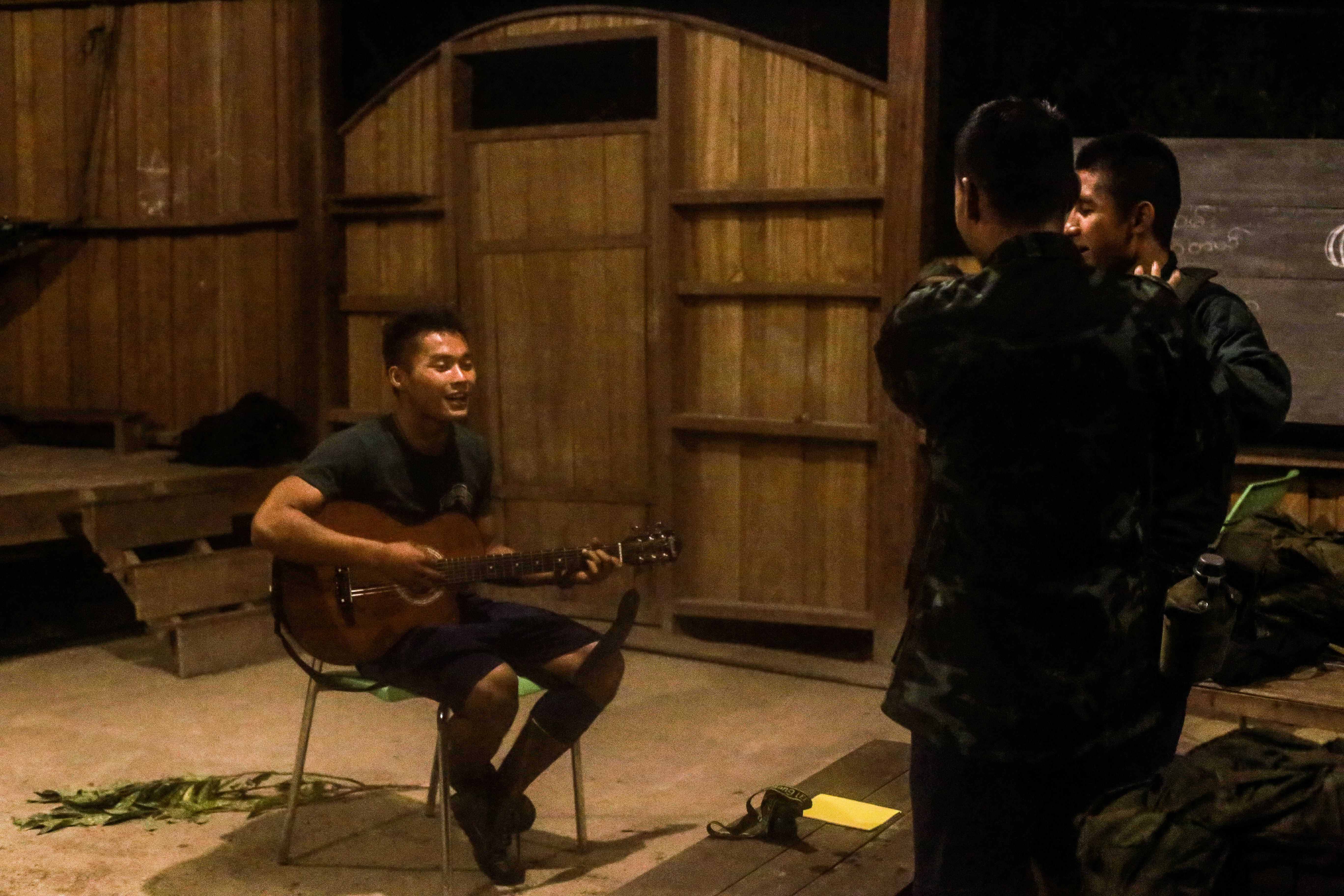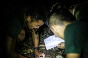 The final written test takes an hour. By the time they’re done, the sun has set and cool air fills the jungle. They head out to the last point, motivated by the fact that they are less than an hour away from finishing the exercise. When they arrive at the final station, everyone celebrates with hugs and high fives.