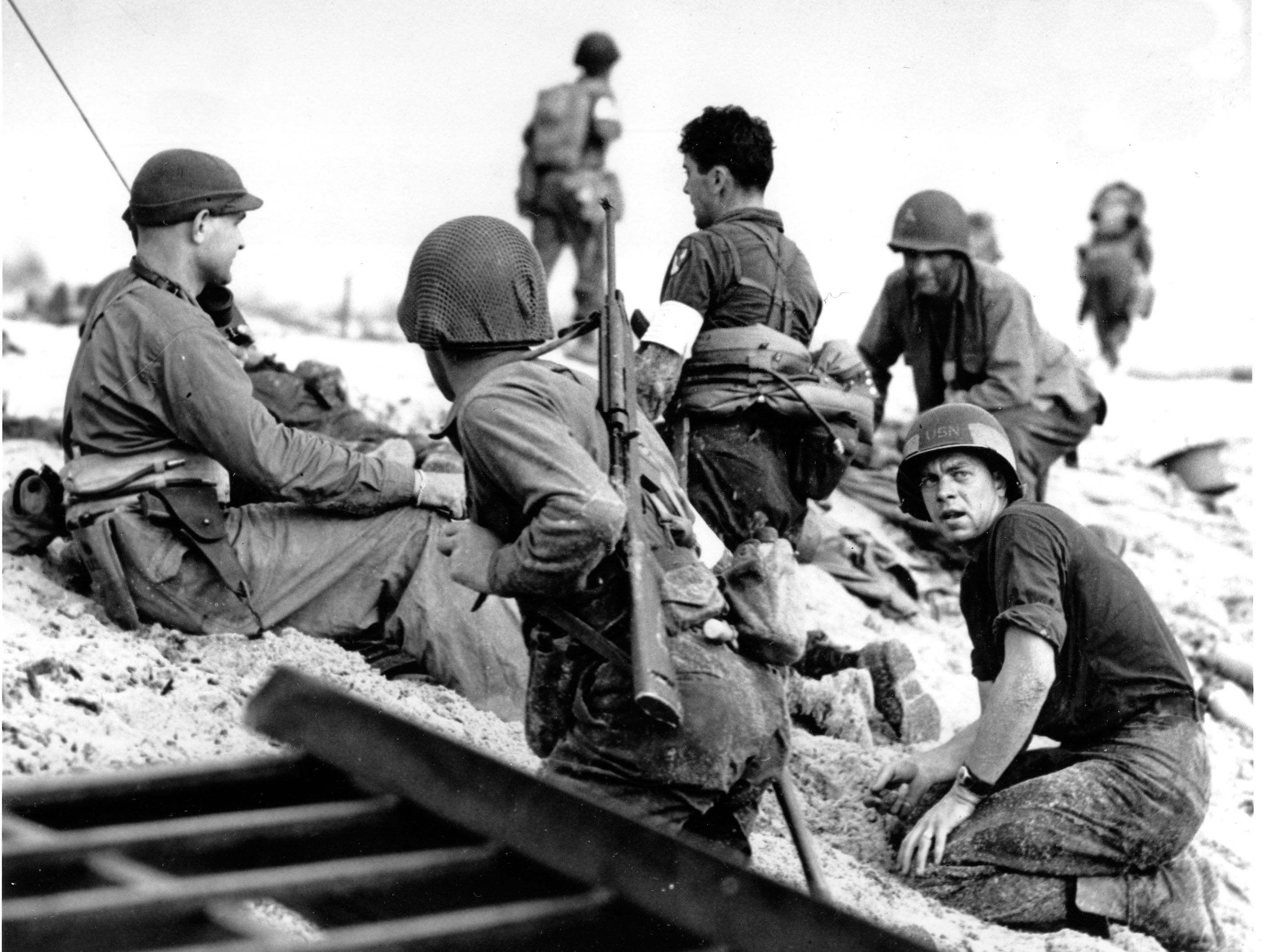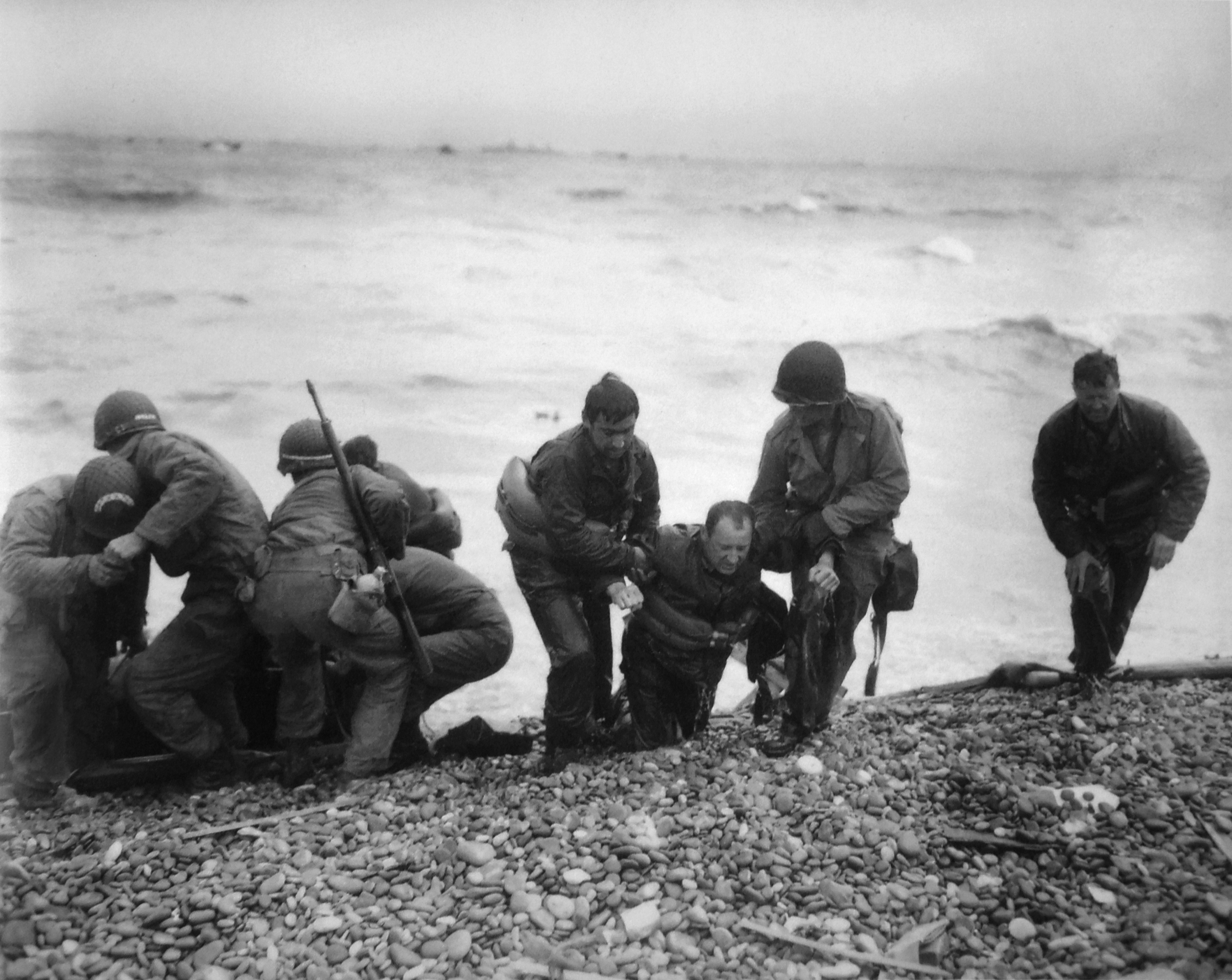 Members of an American landing unit help their exhausted comrades ashore during the Normandy invasion. The men reached the zone code-named Utah Beach, near Sainte-Mère-Église, on a life raft after their landing craft was hit and sunk by German coastal defenses. (AP Photo/INP Pool/Louis Weintraub)