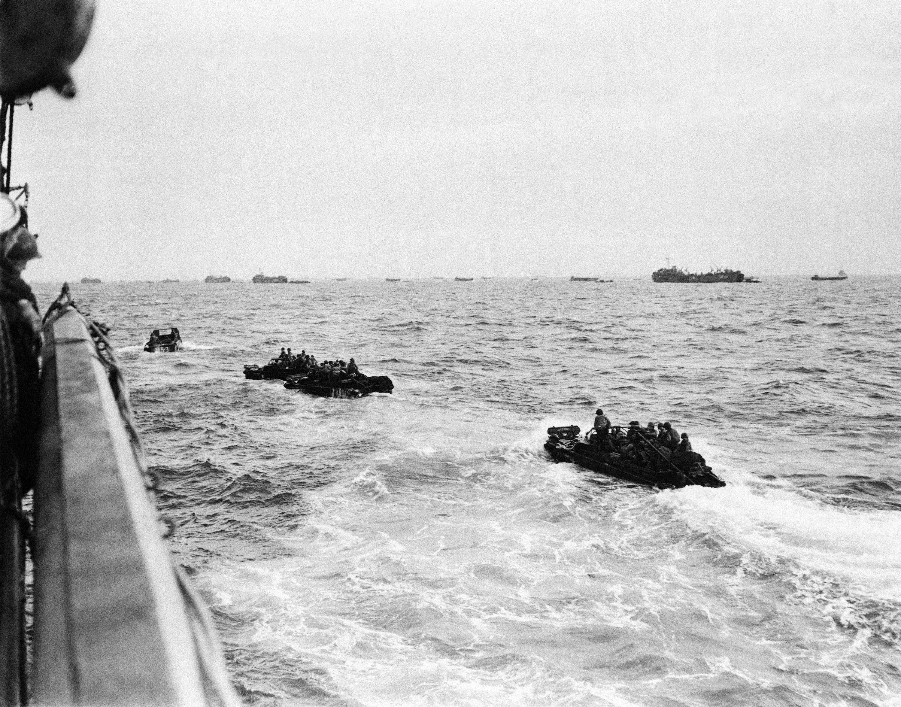 Ducks (amphibious trucks) and a half-track follow troops ashore. (AP Photo/U.S. Coast Guard)
