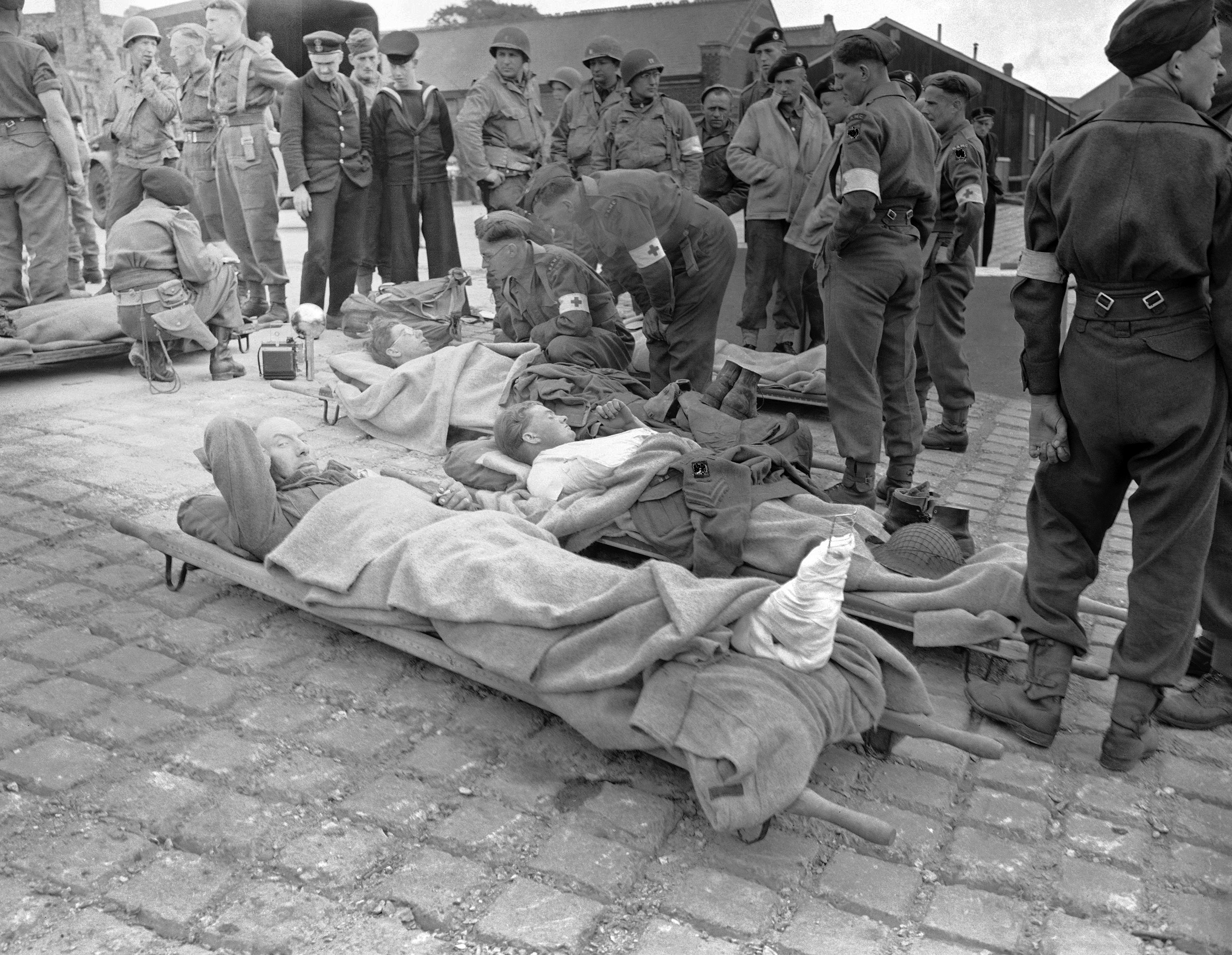 Some of the first British soldiers wounded in the Normandy invasion lie on stretchers somewhere in England, brought back the very day the assault started. (AP Photo/Harry Harris)