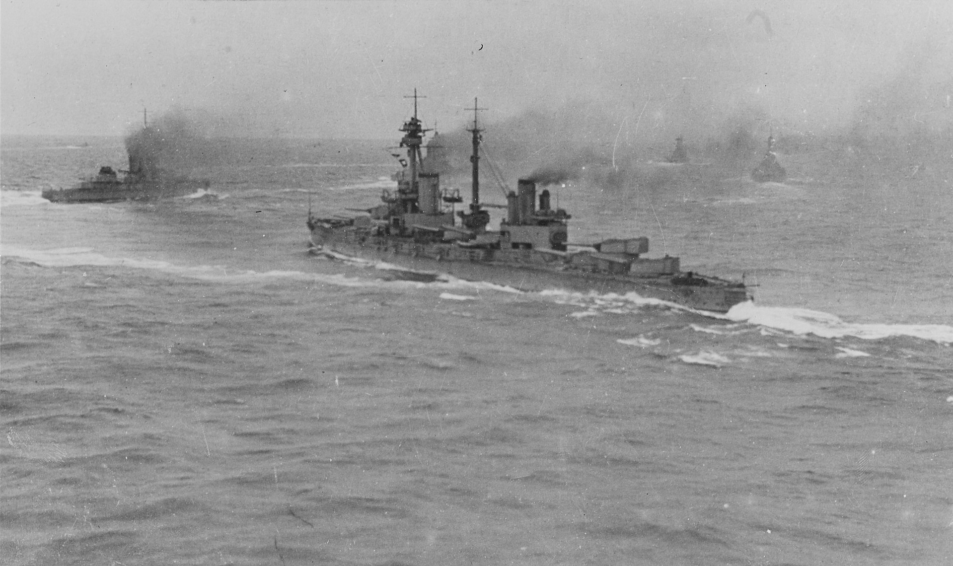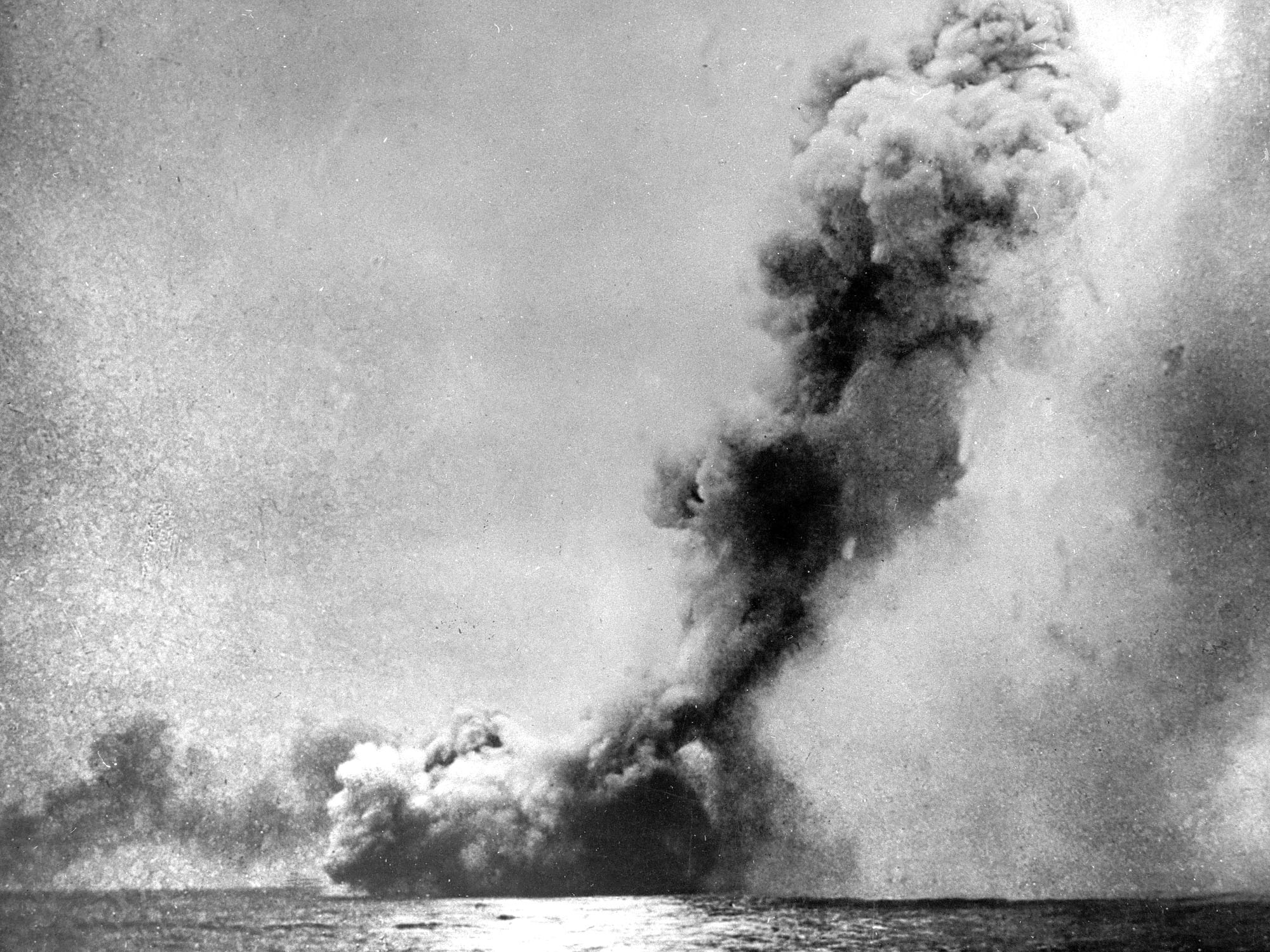 Battle cruisers “Iron Duke,” May 31, 1916, flagship of British Admiral Beatty, right, and “Tiger,” second from right. | AP-Photo/BoughtBritish Battle cruiser “Queen Mary” exploding after powder chamber was hit during the Battle of Jutland, May 31, 1916. | AP-PhotoGerman battle cruiser “Seydlitz” burning in the Battle of Jutland. “Seydlitz” was the flagship of German Vice Admiral von Hipper, who left the ship during the battle. The battle cruiser reached the port of Wilhelmshaven on its own power. | AP-PhotoThe British Grand Fleet under admiral John Jellicoe on her way to meet the Imperial German Navy’s fleet for the Battle of Jutland on May 31, 1916 in the North Sea. | AP PhotoImperial German Navy’s battle ship SMS “Schleswig-Holstein” firing a salvo during the Battle of Jutland on May 31, 1916 in the North Sea. | AP Photo