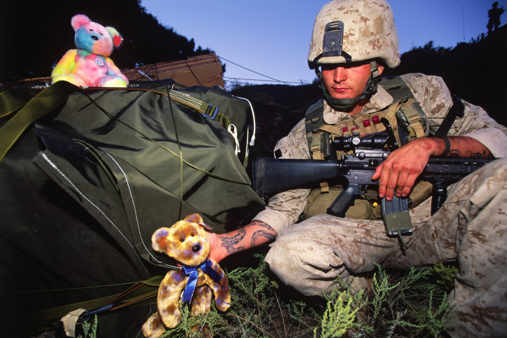 Ed: Found on pages 10-11 of “War Moments,” this is Charles Christmas, a Marine rifleman. He’s showing off a Beanie Baby that Air Force crew members strapped to a parachute resupply drop (called a CDS drop) that had just descended on his platoon’s position deep in the Hindu Kush of eastern Afghanistan’s Kunar Province. Photograph courtesy of Ed Darack.