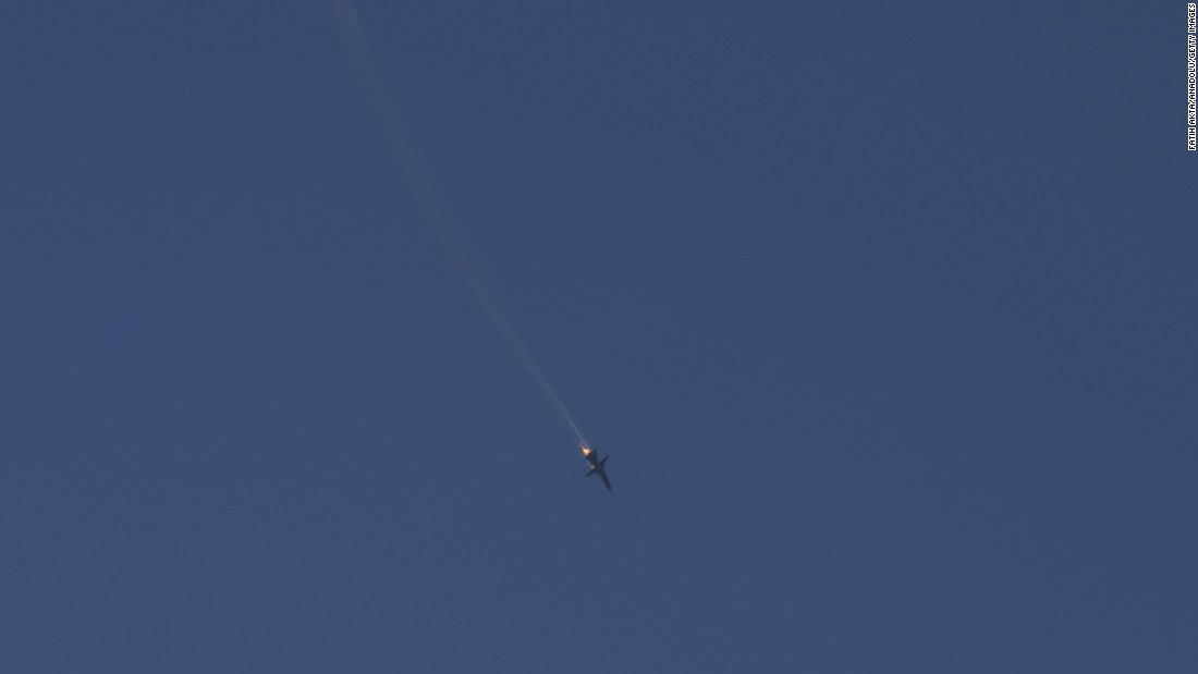 A Russian Air Force Su-24M Fencer plummets toward earth after being shot down by a Turkish F-16. (AP/Reuters)