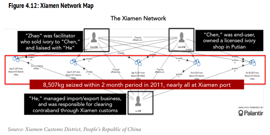Smugglers rely predominantly on shipping to move bulk ivory from East Africa to East Asia (mainly China). C4ADS, using open sources (publicly available information) combined with anonymous interviews, was able to generate high-fidelity intelligence on this smuggling network. They highlight the issue of information existing in silos and advocate the need for an intelligence-fusion center to generate actionable intelligence. Their report leads me to believe that they have generated a great deal of intelligence, fusing data ranging from financial information, money laundering, geospatial data, and law-enforcement reports, with investigative journalism and basic link analysis. One of their most significant suggestions was that, in the absence of government bodies doing this analysis, a NGO like C4ADS could potentially do it on a contracted basis.