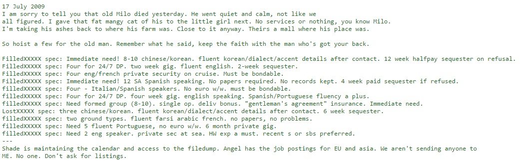 Other postings include hotel room numbers and other types of specific locations. By tying this strange discovery to the Reddit and FARK.com posts of ROP and his mourning friend 2-7, a picture begins to develop; the website appears to host requests for contract killers.