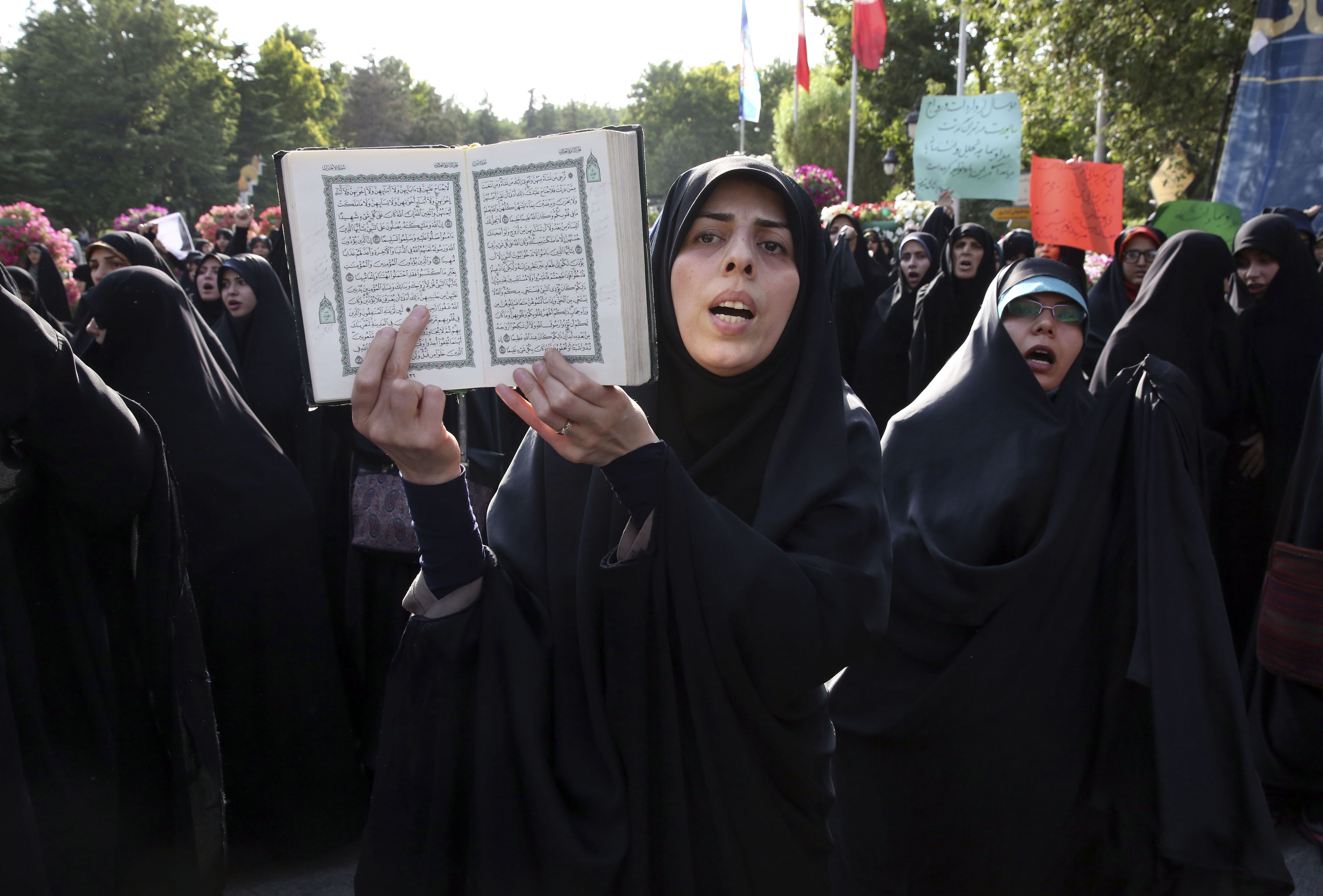 An Iranian woman chants slogan as she holds a copy of the Quran, Islam’s holy book, in a demonstration of religious citizens to protest against non-observance of Islamic dress code in northern Tehran, Iran, Saturday, July 12, 2014. Some 500 people attended the rally calling upon officials to take harsher actions against women with loose headscarves and tight clothes. As the summer has approached and weather gets hot, many women wear colorful, more comfortable clothes and loose headscarves, a fashion that some traditional religious people and hard-liners refer to “bad hijab” and view as an imported Western culture. Under the country’s current Islamic regulations, women should cover themselves head to toe, with their faces allowed to show. | AP Photo/Vahid Salemi