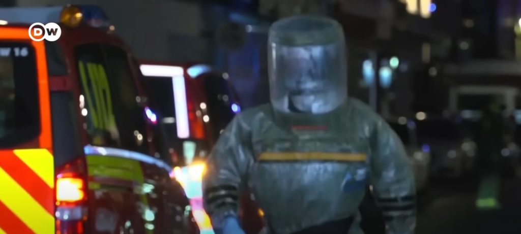 German SEK (Spezialeinsatzkommando) police special forces were, according to reports in The Guardian, first on the scene arriving onsite in a fire truck to hide their identity and purpose. A decontamination unit from Germany’s disease control and prevention agency was also on site, in addition to a detonation unit.