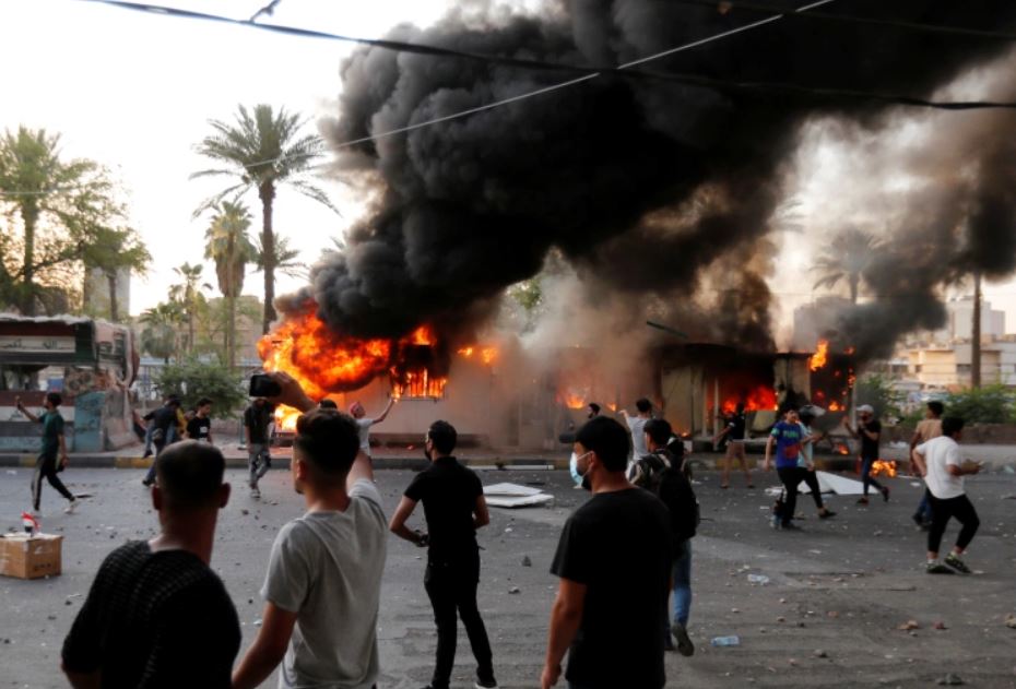 Iraqi protesters burn tires in the PMF run area of Baghdad. many of the protesters were killed by the militia recently (Reuters)