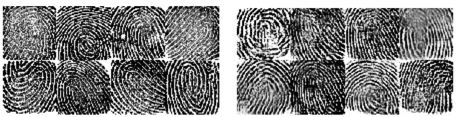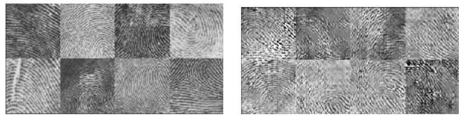 Examples of real fingerprints are on the left and AI-generated fake fingerprint images are on the right. Philip Bontrager et al., “DeepMasterPrints: Generating MasterPrints for Dictionary Attacks via Latent Variable Evolution ∗,” 2018.