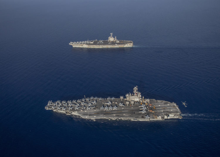 The Nimitz-class aircraft carriers USS George H.W. Bush (CVN 77) and USS Harry S. Truman (CVN 75) sailing around the US 6TH Fleet Area of Responsibility on August 2022. (US Navy photo by Mass Communication Specialist Seaman Samuel Wagner/DVIDS)