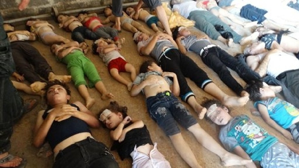 This heartbreaking, image provided by Shaam News Network, which has been authenticated, shows bodies of victims of a nerve gas attack on Ghouta, Syria. Photo shared from khqa.com.