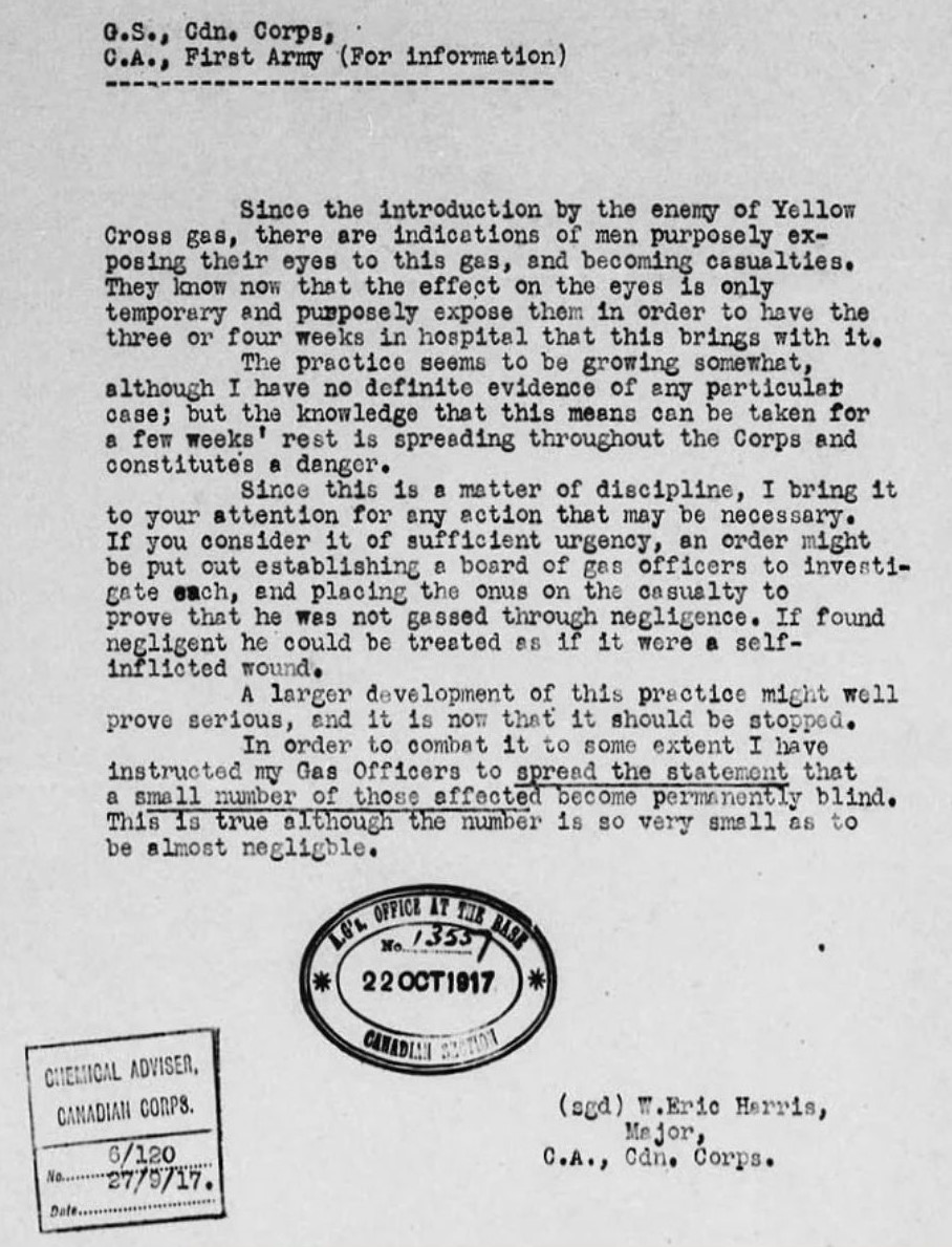 This letter from a Canadian officer describes how some soldiers were exposing themselves to small amounts of mustard gas in order to be pulled from the battlefield for a few weeks. In some cases, it backfired, blinding the men permanently. Image courtesy of simonjoneshistorian.com