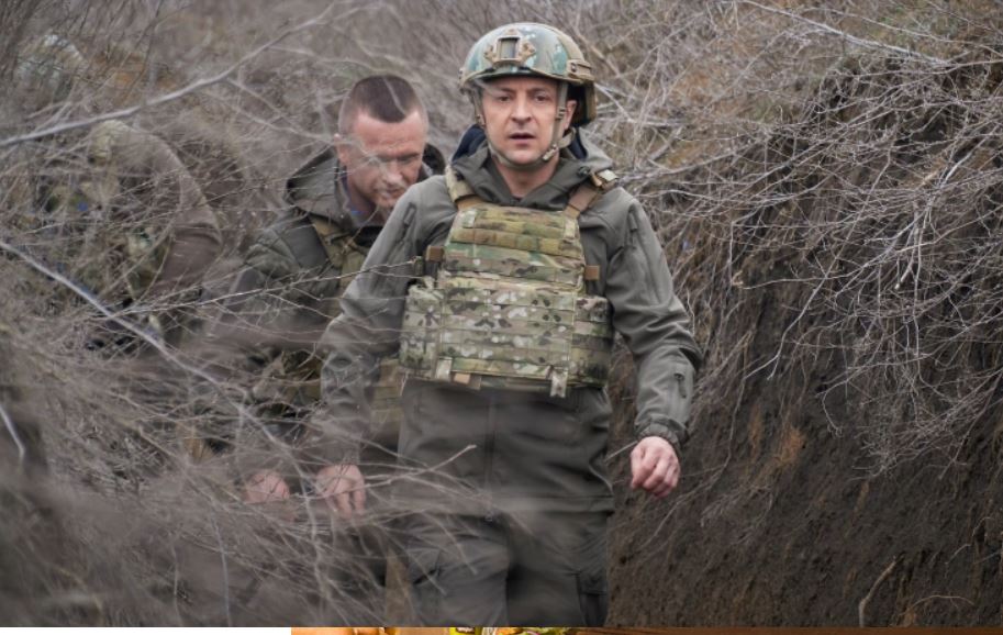 Ukraine President Zelensky visits the front-line troops as the Russians massed troops on their border. (Ukraine government photo)