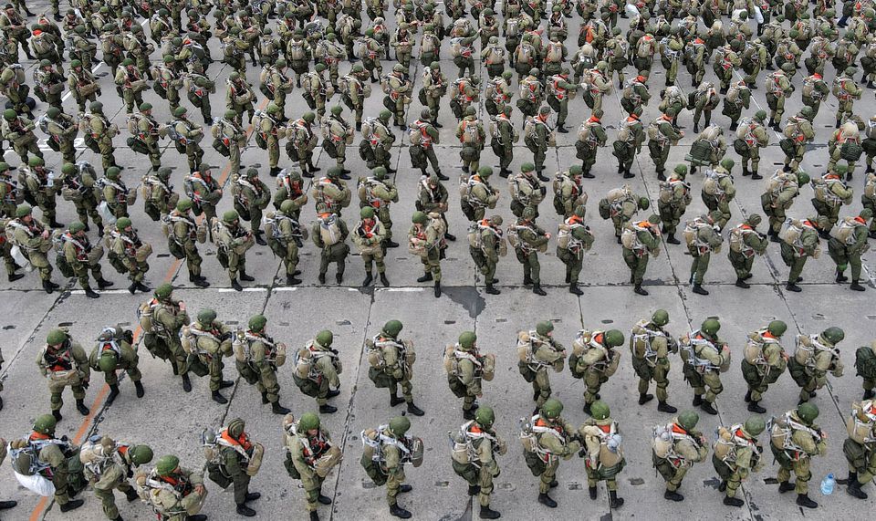 Russian paratroopers prepare to board an IL-76 aircraft near the Sea of Azov in April of 2021.