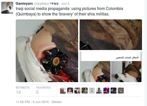 Notice the patch says “Quimbaya.” First of all, you aren’t going to see Roman characters on an Iraqi patch. Second of all, Quimbaya is a city in Colombia, in Quindio Department. This incident happened over 7,600 miles from the fighting against ISIS.