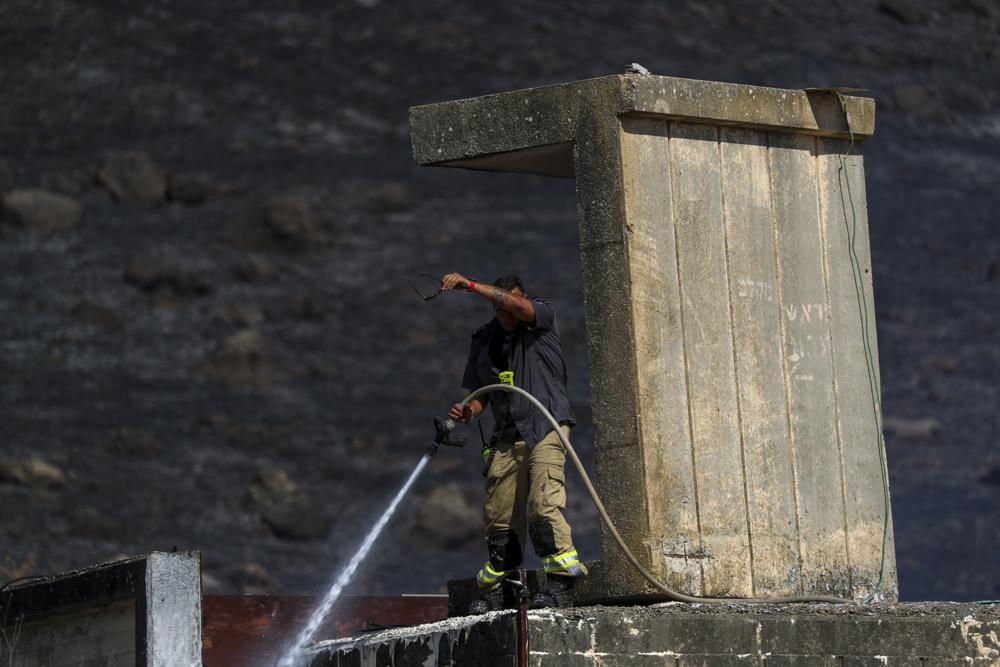 Israeli firemen respond to a fire in Kiryat Shmona after rockets fired from Lebanon sparked fires. (AP photo)