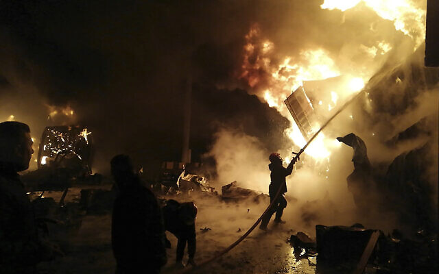 In this photo released by the Syrian official news agency SANA, firefighters try to douse the flames in the container facility of the port of Latakia after an Israeli airstrike. (SANA via AP)