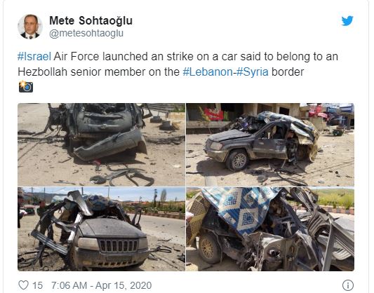 Other reports stated that a vehicle was carrying four Hezbollah fighters just inside Syria about 200 meters from the customs stop near the Lebanese border. An Israeli drone that was monitoring the vehicle fired a missile at the Jeep and missed. That caused the four Hezbollah men, including the senior officer to flee, seconds before the second missile destroyed the vehicle.