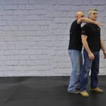 Continue to turn into the attacker’s choking arm. As you continue to turn, wrap or “marry” your lower leg and calf to the attacker’s leg. It is crucial that your keep your leg snug against the attacker’s for the pending takedown and pivot on the ball of your foot. Importantly, if you do not keep your leg braced against the attacker, he can turn with you to continue applying the choke and the technique will not work.