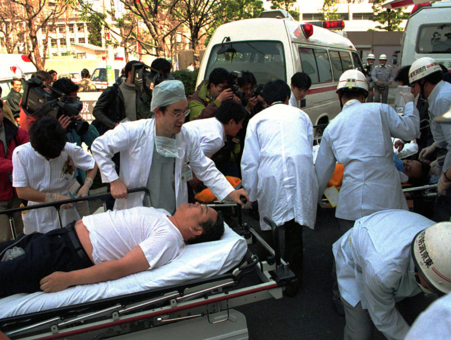 Subway passengers are taken on stretchers from ambulances outside a Tokyo hospital after falling victim of the nerve gas attack by the Aum Shinrikyo cult on a subway on March 20, 1995. | AP Photo/Chiaki Tsukumo, File