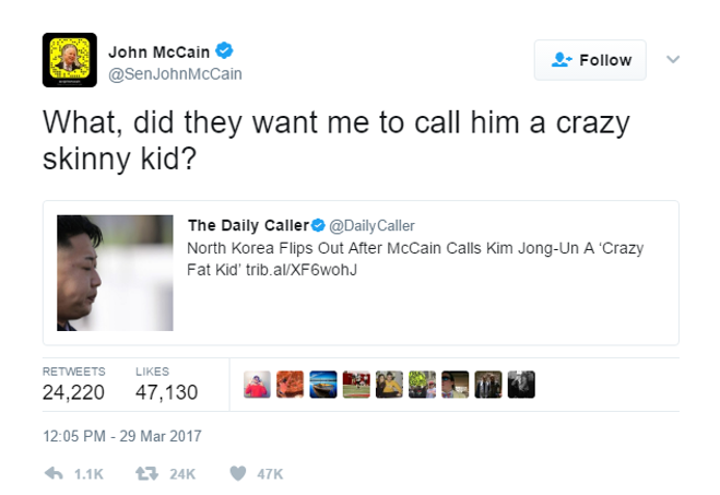 In a television interview earlier this month, McCain called the dictator a “crazy fat kid” who shows no rational thought or behavior. He also said that “we’re not dealing even with someone like Joseph Stalin, who had a certain rationality to his barbarity.”