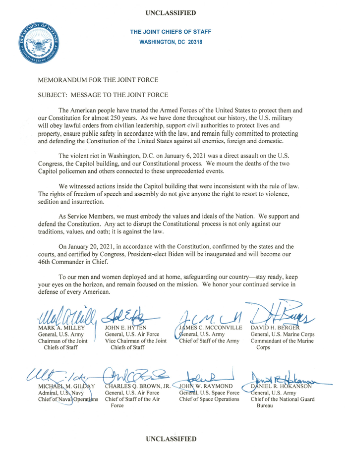 Yesterday, the Joint Chiefs of Staff issued a memorandum to the Armed Forces calling the recent riot in Washington DC, “a direct assault on the U.S. Congress, the Capitol Building, and the Constitutional process.” Copies of this “Message to the Joint Force” will be read to or distributed to every member of the Armed Forces around the world.