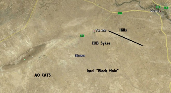 The politics that effected this overall situation are elborated upon in my previous article. This entire region south of Mosul/Tal Afar was more or less considered to be an intelligence black hole where there were few patrols and no one really knew what was going on there day to day. This was a situation that my ODA attempted to correct but we also had other respondsibilities and the LRS unit on FOB Sykes did much better work in this regard.