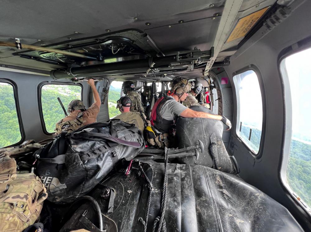 A Kentucky National Guard flight crew from 2/147th Bravo Co. aided in flood relief efforts in response to a declared state of emergency in eastern Kentucky on July 29, 2022. Their mission consists of supporting Soldier movement, joint support transport, delivery of emergency supplies, and surveying flooded areas looking for Kentucky survivors. (U.S. Army National Guard Photo by Sgt. Jesse Elbouab)