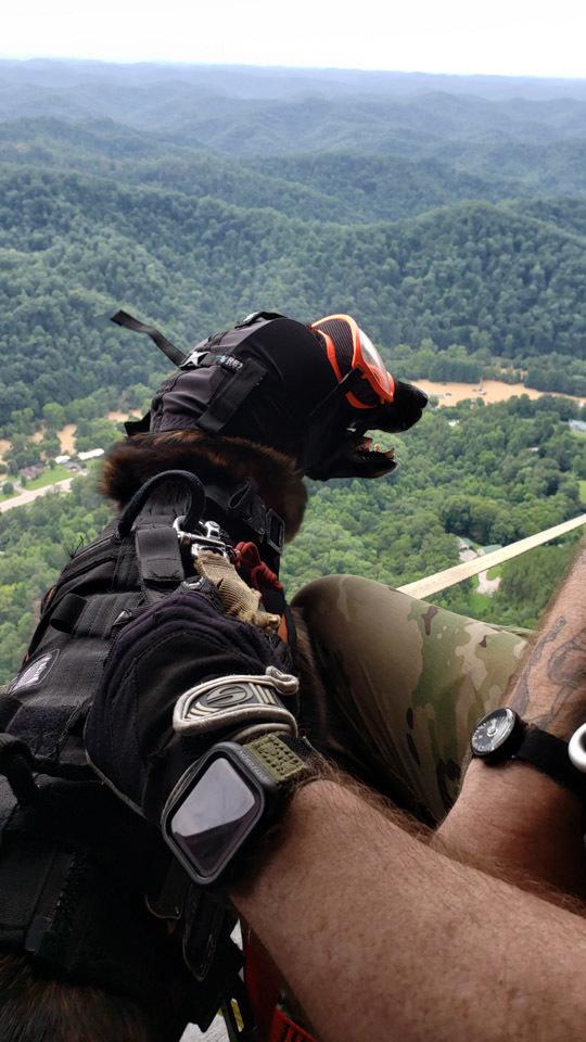 A Kentucky National Guard Soldiers and Airmen aided in flood relief efforts in response to a declared state of emergency in eastern Kentucky late July 2022. This dog may be used to search for the dead.(U.S. Army National Guard Photo by Sgt. Jesse Elbouab)