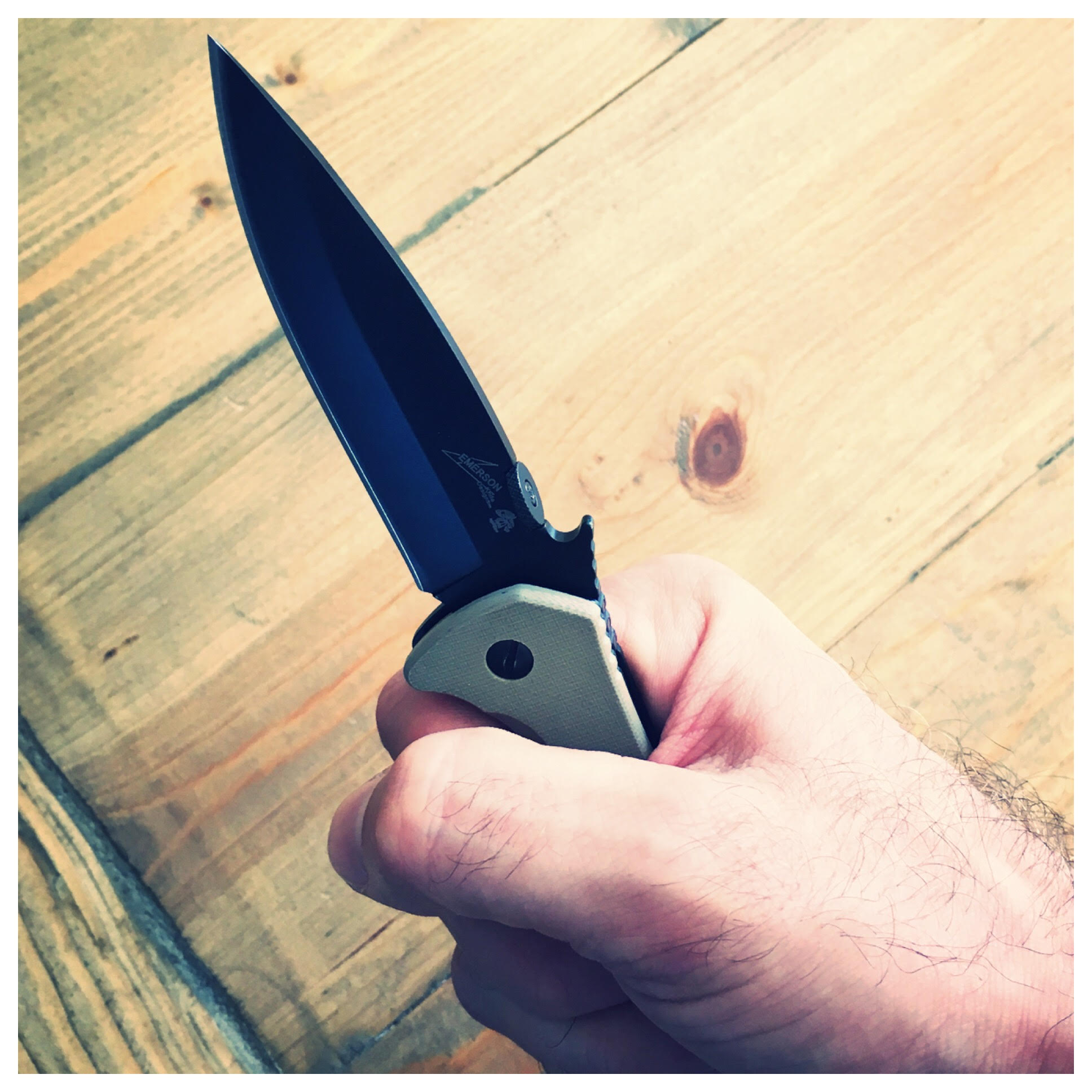 The CQC-4K features a drop-point blade for multi-purpose cutting capability. Probably the most aesthetically pleasing one of the four knives I reviewed. The contrast of the black-oxide back and the desert tan G-10 front look sharp. A small Emerson skull logo is on the blade and the pocket clip as with the others, so if skulls aren’t something you’re into then you’ve been warned. I personally like the look and feel of this one, although the blade and frame lock were both a bit stiff until it had been used a bit for a few days.