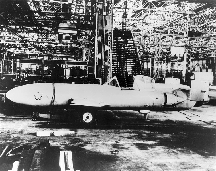 A Japanese Yokosuka MXY 7 Ohka in a damaged hangar. (US. Navy, Public domain, via Wikimedia Commons)