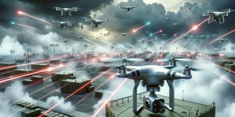 Cutting-edge laser defense systems engage swarming drones over a fortified military base, highlighting the ongoing clash between advanced technology and traditional warfare tactics in modern conflict zones. Original illustration by SOFREP.