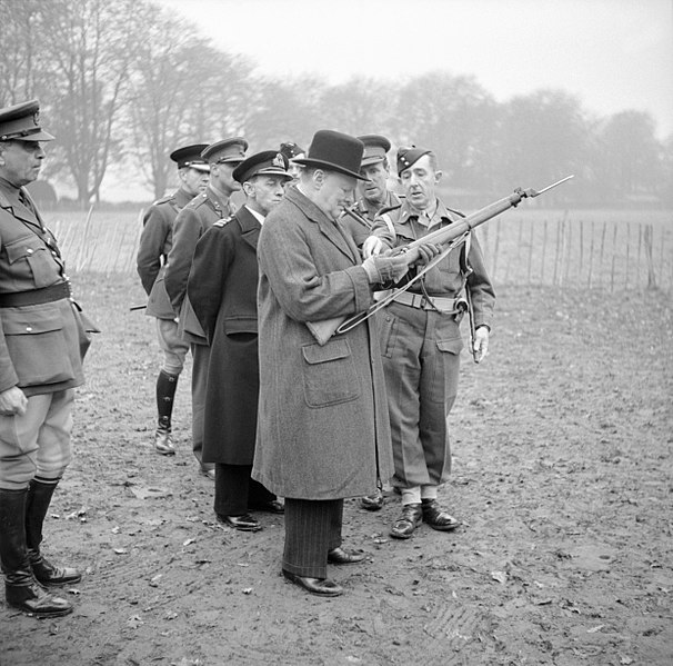 Winston Churchill inspects the new Lee-Enfield No. 4 Mk 1 rifle during a visit to 53rd Division in Kent, November 20, 1942. (Horton (Capt), War Office official photographer, Public domain, via Wikimedia Commons)