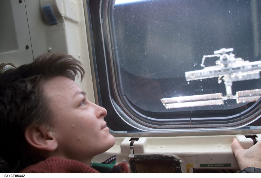 Astronaut Peggy A. Whitson, Expedition Five NASA ISS science officer, looks at the International Space Station through a window on Space Shuttle Endeavour following the undocking of the two spacecraft. (NASA)
