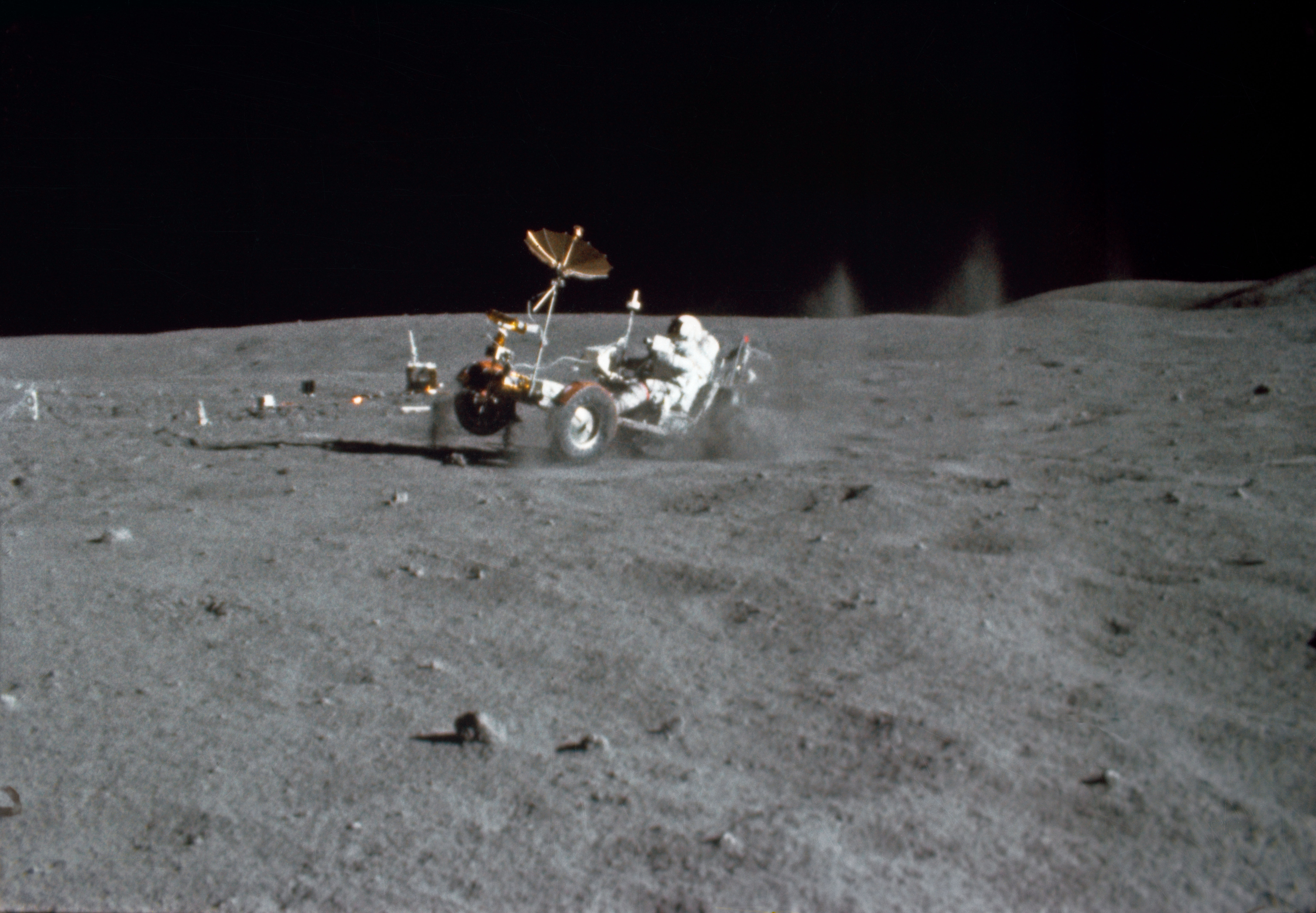 The Lunar Roving Vehicle (LRV) gets a speed workout by astronaut John W. Young in the “Grand Prix” run during the first Apollo 16 spacewalk at the Descartes landing site on April 21, 1972.