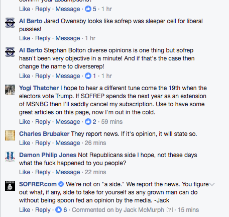 What the commenters are saying is that they want SOFREP to provide confirmation bias for their pre-conceived views. More than just that, I find that there is a large contingent on the internet that seems to truly believe that we should just stop reporting anything about President Elect Donald Trump. Hiding in their safe space under their bed sheets, they scream, “LEAVE BRITNEY ALONE!” But it isn’t the news media’s job to leave anyone alone. Back in 2008 when America was experiencing Obama-mania I was one of those trying to bring people back down to Earth. I’m doing the same today. These are human beings working within our current political framework, not saints shooting lighting bolts out of their asses at America’s enemies.
