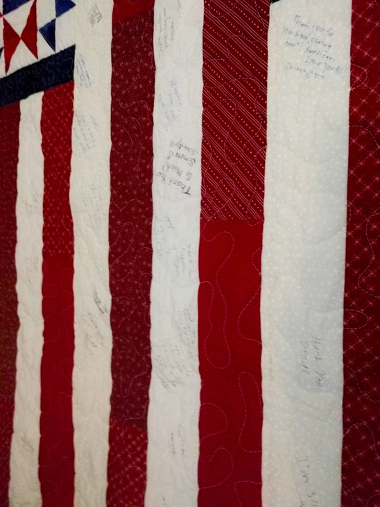 My grandmother has many talents, one of which is making quilts. She’s made myself, my brother and my cousins several quilts upon high school graduation or other significant life events. She is a part of a quilting guild, and when they had heard what happened to me they got to work creating what they called a “Quilt of Valor.” They finished and gave me the quilt, each one having signed it.